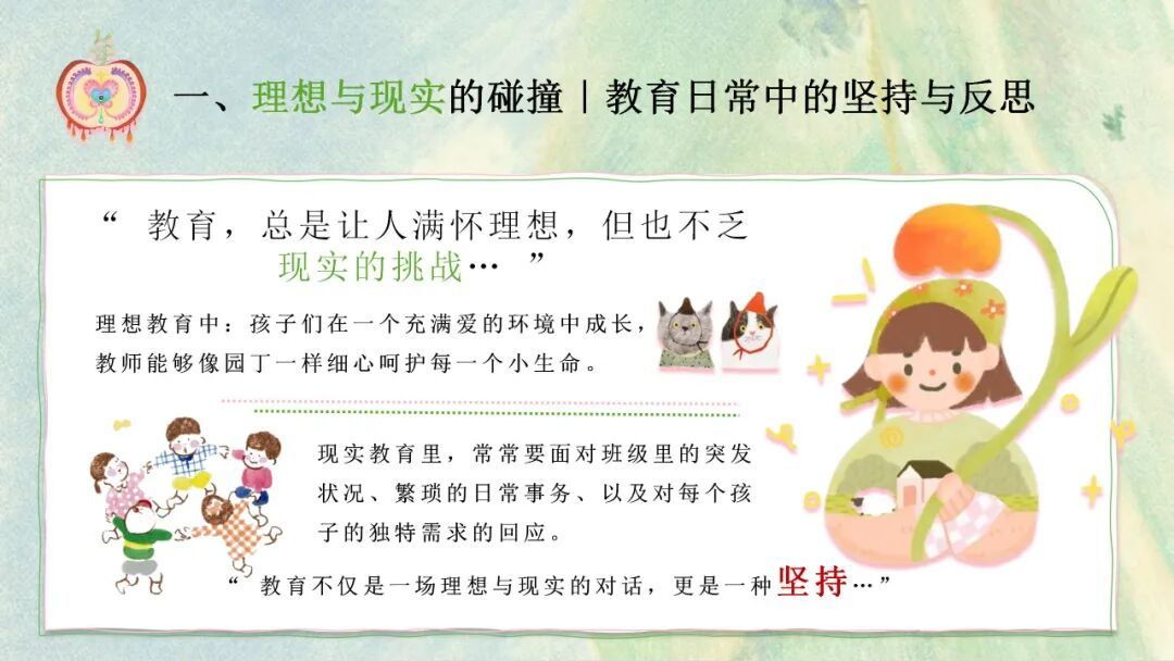 陈惠婷老师分享 的是 《爬上豆蔓看自己》 。她认为在 教育路上 难免会有 琐碎挑战,但唯有坚持反思,方能守住初心。与孩子相处, 我们 要建立从眼神到心灵 的 链接,读懂他们的独特视角,尊重每个小小心灵的表达。教育的意义,便 是 在这份温柔守护中,成为孩子心灵的引路人,陪他们探索世界、直面挑战,在点滴中唤醒成长的力量。