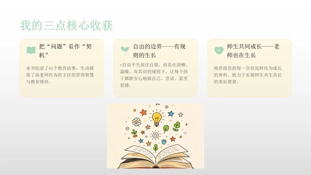 杨思微老师分享《一间自由生长的教室》,她从中读懂教育中要将问题视作师生共同成长的契机,懂得自由并非放任,而是让孩子在清晰温暖的规则下安心试错、做自己。教育是彼此成就的共生,教师要多看见、多肯定孩子的闪光点。杨老师也提到她也计划将这份智慧落地教学,以微表扬、夸夸墙等方式,打造充满生命力的教室,做点亮孩子生命的点灯人。