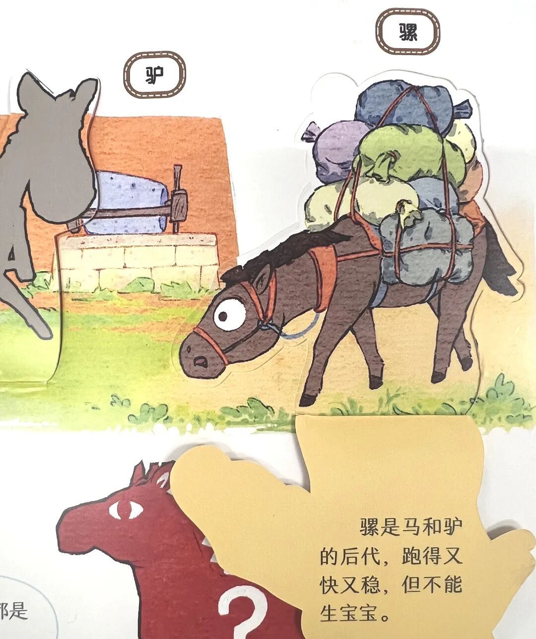 它们是马家族的!而且翻开机关就能看到,骡子是马和驴的后代,跑得快又稳,但不能生宝宝。
