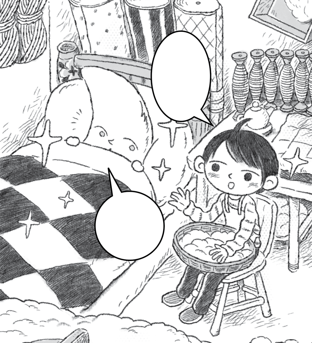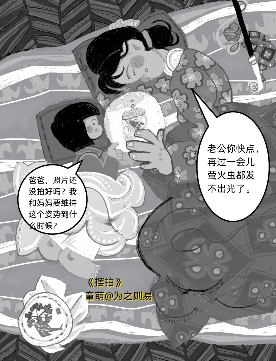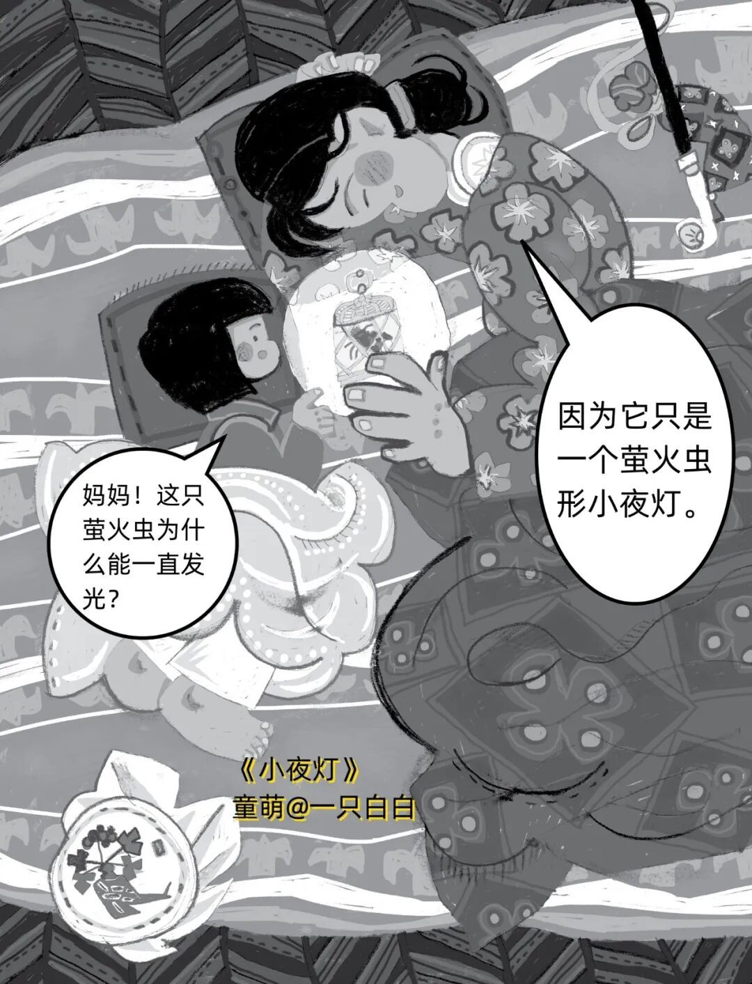 点评:这个脑洞将重点放在画面当中的“光芒”上,在孩子眼中,即便是小夜灯的光芒,也会认为是萤火虫的微光,并且一直坚信它能够长时间发光。这个对话描写的生活化场景,刻画出了孩子的天真,有一种童话般的浪漫。
