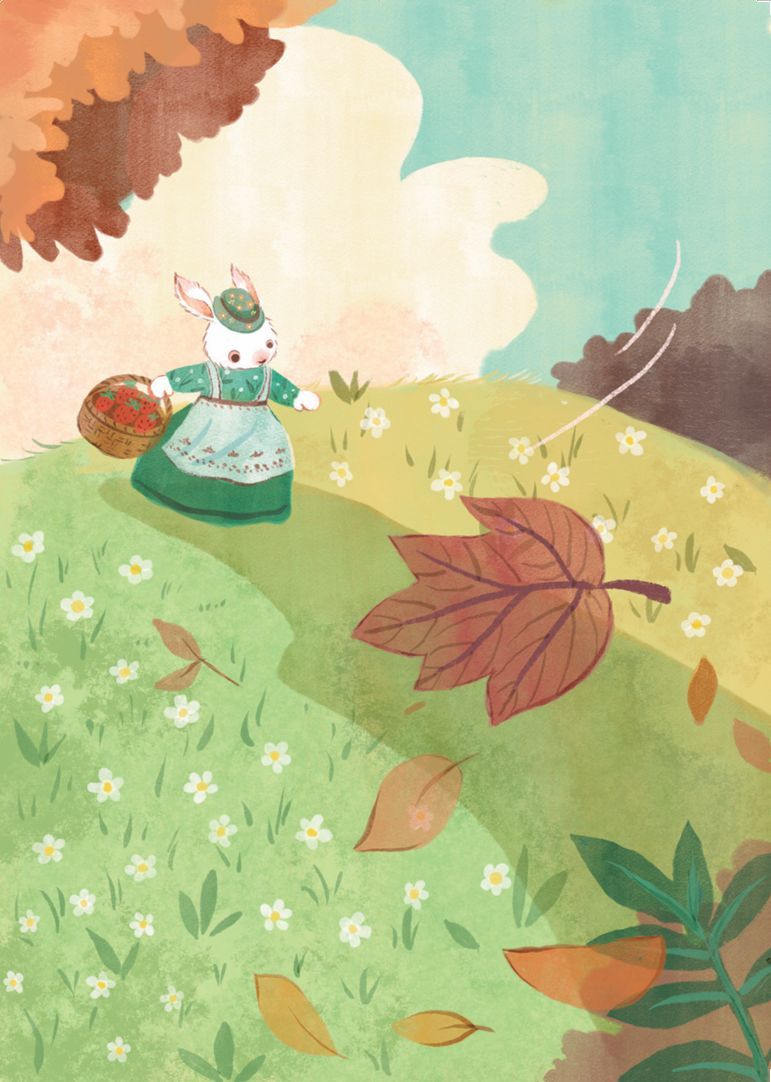 在一个蜜饯颜色的下午,蓝天白云下的田野里,一只雪白的小兔子正戴着饰有橘色小花的帽子,手里提着一个装满野草莓的篮子,心情愉快地唱着歌。一阵风捎来一片暗红色的树叶,慢悠悠地飘落到小兔子的帽子上。咦?树叶上居然写着字……