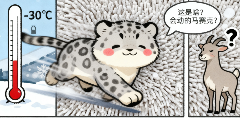 1.捕猎隐身挂:静止时是“雪山背景板”,移动时斑纹还会“动态干扰”,猎物看它就像看“会动的马赛克”,直接懵圈。