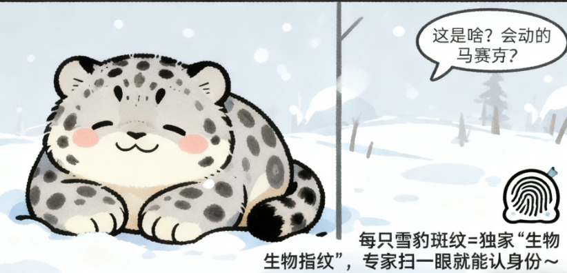 3.身份识别挂:每只雪豹的斑纹都是“独家皮肤”,专家扫它的斑纹就跟我们扫二维码一样,秒辨身份,想冒充?没门儿