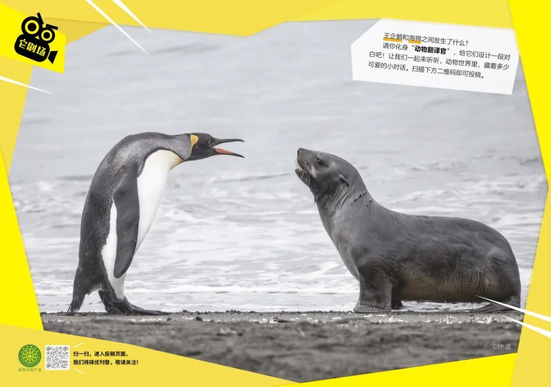 王企鹅和海狮之间发生了什么?请你化身“动物翻译官”,给它们设计一段对白吧!