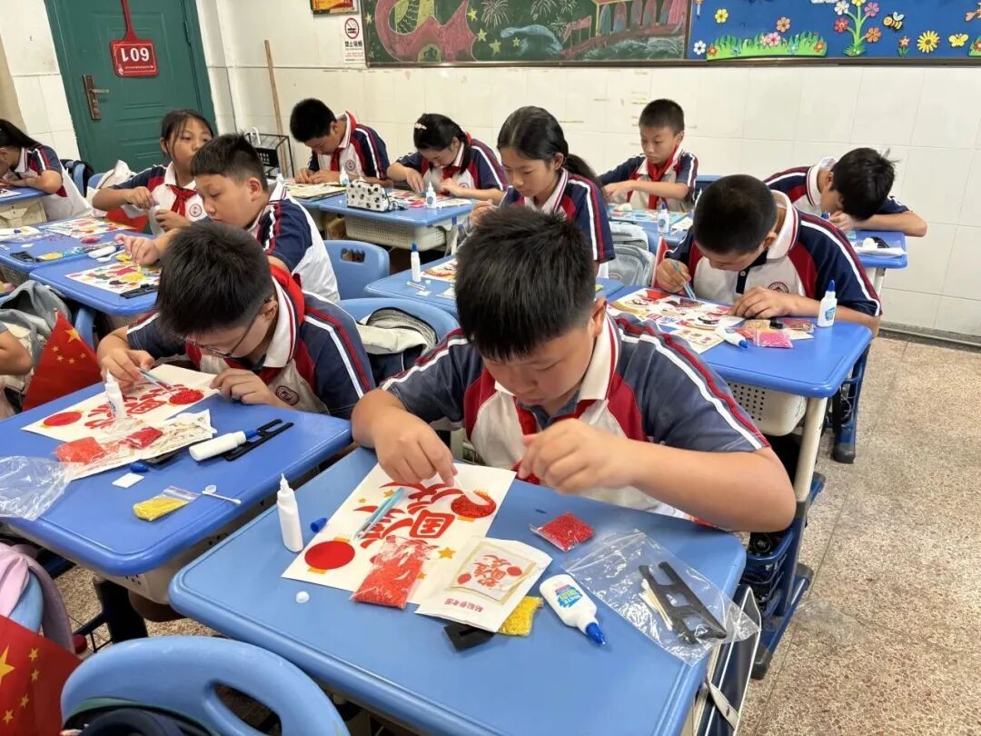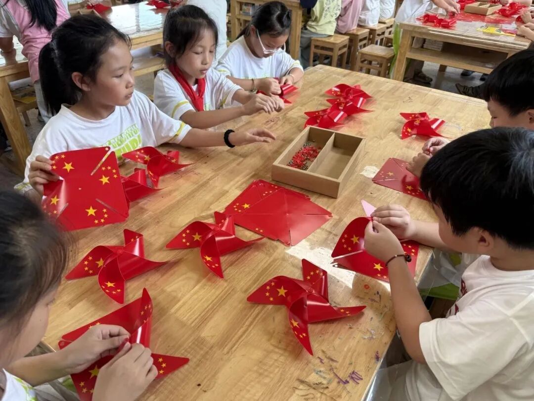 一、二年级的同学们写下最真挚的祝福,折成纸飞机,寄托美好愿望;三年级的少先队员们制作小风车,一个个风车旋转出对祖国的深情祝福;四年级队员用卡片书写祝愿,字字句句饱含赤子之心;五年级队员巧手编织竹艺挂饰,传递对国泰民安的祈愿;六年级则用五谷杂粮拼绘出祖国壮丽山河,展现中华文化的深厚底蕴。