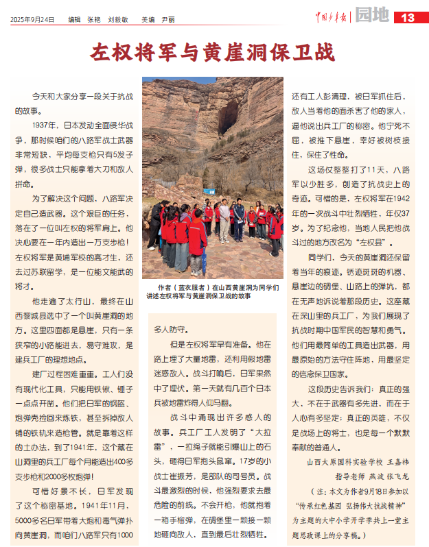 还有工人彭清理,被日军抓住后, 敌人当着他的面杀害了他的家人,逼他说出兵工厂的秘密。他宁死不 屈,被推下悬崖,幸好被树枝接住,保住了性命。这场仗整整打了11天,八路军以少胜多,创造了抗战史上的 奇迹。可惜的是,左权将军在1942年的一次战斗中壮烈牺牲,年仅37岁。为了纪念他,当地人民把他战斗过的地方改名为“左权县”。同学们,今天的黄崖洞还保留着当年的痕迹。锈迹斑斑的机器、 悬崖边的碉堡、山路上的弹坑,都在无声地诉说着那段历史。这座藏在深山里的兵工厂,为我们展现了抗战时期中国军民的智慧和勇气。 他们用最简单的工具造出武器,用最原始的方法守住阵地,用最坚定的信念保卫国家。这段历史告诉我们:真正的强大,不在于武器有多先进,而在于人心有多坚定;真正的英雄,不仅是战场上的将士,也是每一个默默奉献的普通人。