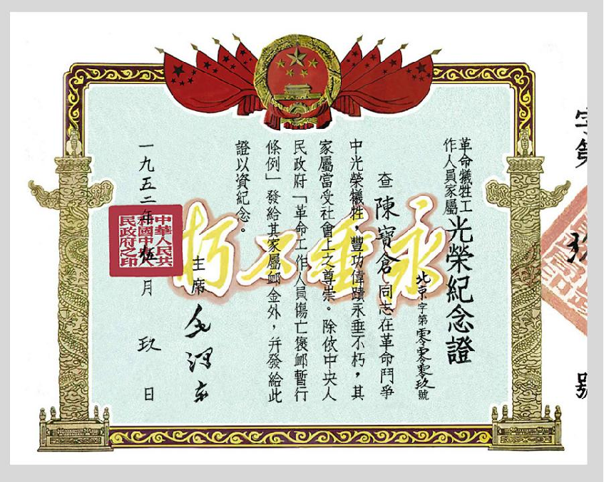 卢勤奶奶:在我童年的记忆中,家里一直悬挂着一张写着“永垂不朽”的革命烈士纪念证。它的编号是零零零玖,由毛泽东同志签署。