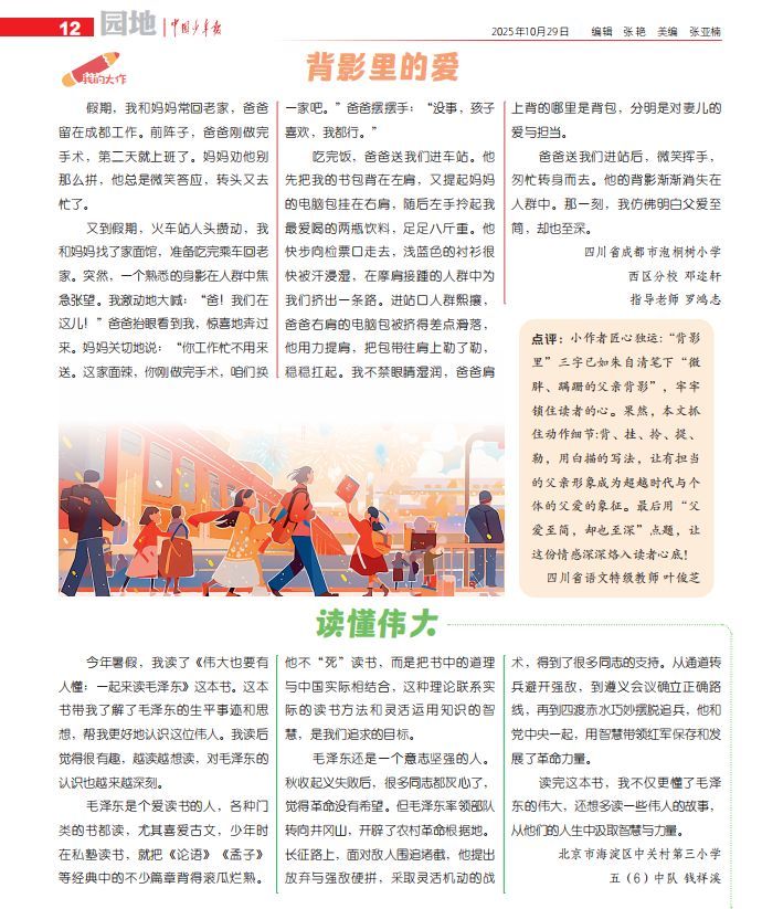 吃完饭,爸爸送我们进车站。他先把我的书包背在左肩,又提起妈妈的电脑包挂在右肩,随后左手拎起我最爱喝的两瓶饮料,足足八斤重。他快步向检票口走去,浅蓝色的衬衫很快被汗浸湿,在摩肩接踵的人群中为我们挤出一条路。进站口人群熙攘,爸爸右肩的电脑包被挤得差点滑落,他用力提肩,把包带往肩上勒了勒,稳稳扛起。我不禁眼睛湿润,爸爸肩上背的哪里是背包,分明是对妻儿的爱与担当。