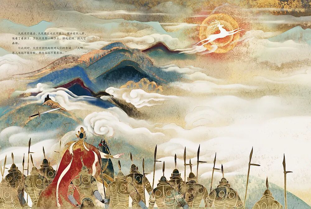 青年插画家尧立担纲绘画创作,用插画语言诠释九色鹿灵韵和壁画艺术,让敦煌美学住进孩子心里。