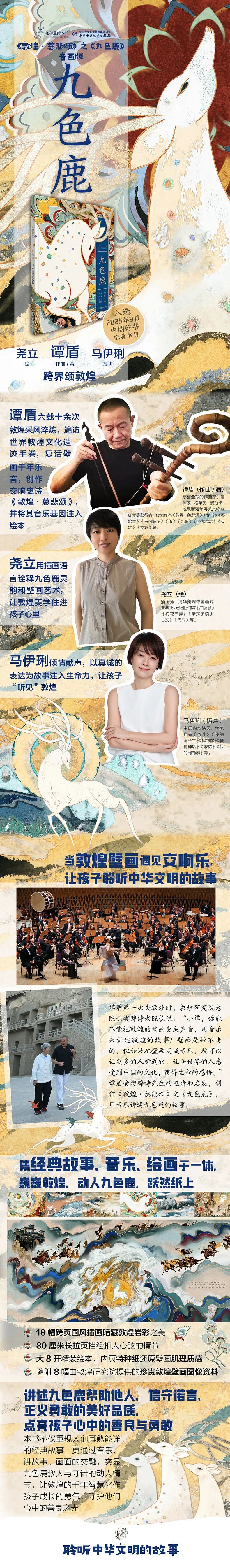 当享誉世界的音乐家谭盾、备受瞩目的国风插画师尧立、著名演员马伊琍,为了一个共同的目标——将敦煌的魅力带给今天的孩子们——而聚在一起时,会创造出怎样的作品?中国少年儿童出版社将这份难得的跨界合作,凝聚成了《九色鹿》音画绘本,旨在打造一扇通往中华文明宝库的窗口,为孩子们提供沉浸式美学启蒙。