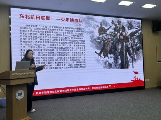 近日,在北京市建华实验亦庄学校多功能厅,百余位师生代表共同聆听了一堂以“弘扬伟大抗战精神,争做共产主义接班人”为主题的思政课。在课上,主讲人中国近现代史史料学学会理事、辽宁作家协会会员李姝讲授了杨靖宇将军和他领导的抗联少年营的抗战传奇故事。