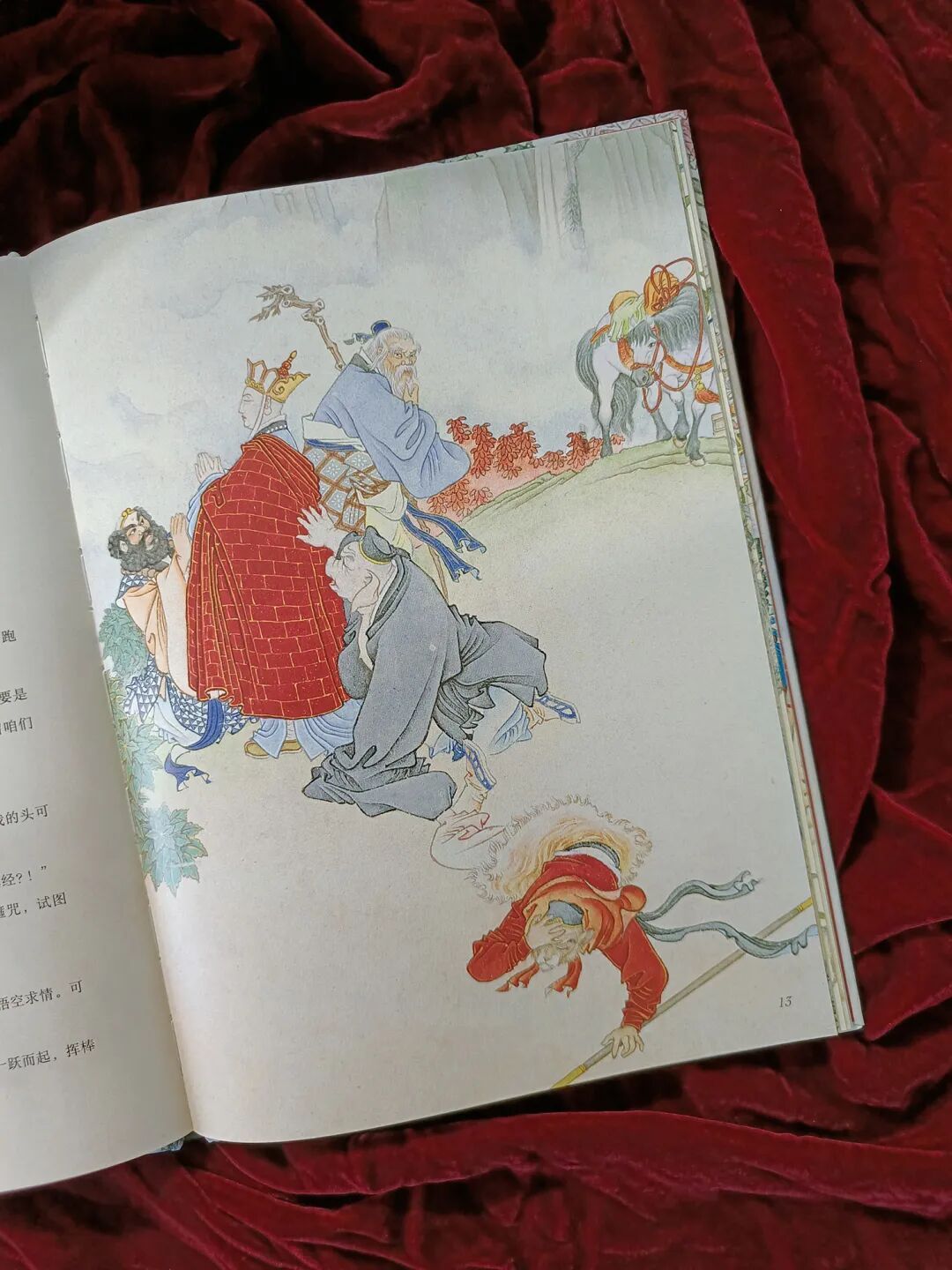 翻开《大闹天宫》,国画大师刘继卣笔下的孙悟空跃然纸上:金丝软甲折射着微光,火眼金睛迸发出不羁的神采,每一根毫毛都透着灵动;《武松打虎》中,人与虎对峙的瞬间张力拉满,画家以遒劲的线条勾勒出武松的英武,用浓烈的色彩渲染出山林的肃杀。这些曾在中国美术馆展出的真迹,如今以大16开本、精美印刷的形式呈现在孩子眼前,每一次翻阅都是与艺术大师的对话——瑶池宴会上那些仿佛能闻到香气的琼浆玉液,孙悟空因唐僧念紧箍咒疼得倒地而白骨精变换的老翁却一脸得意,武松从睡梦中被虎啸惊醒的刹那,以及李逵闹事时扯下的精美文人画……这样的沉浸式体验,让孩子的审美力悄然生长。