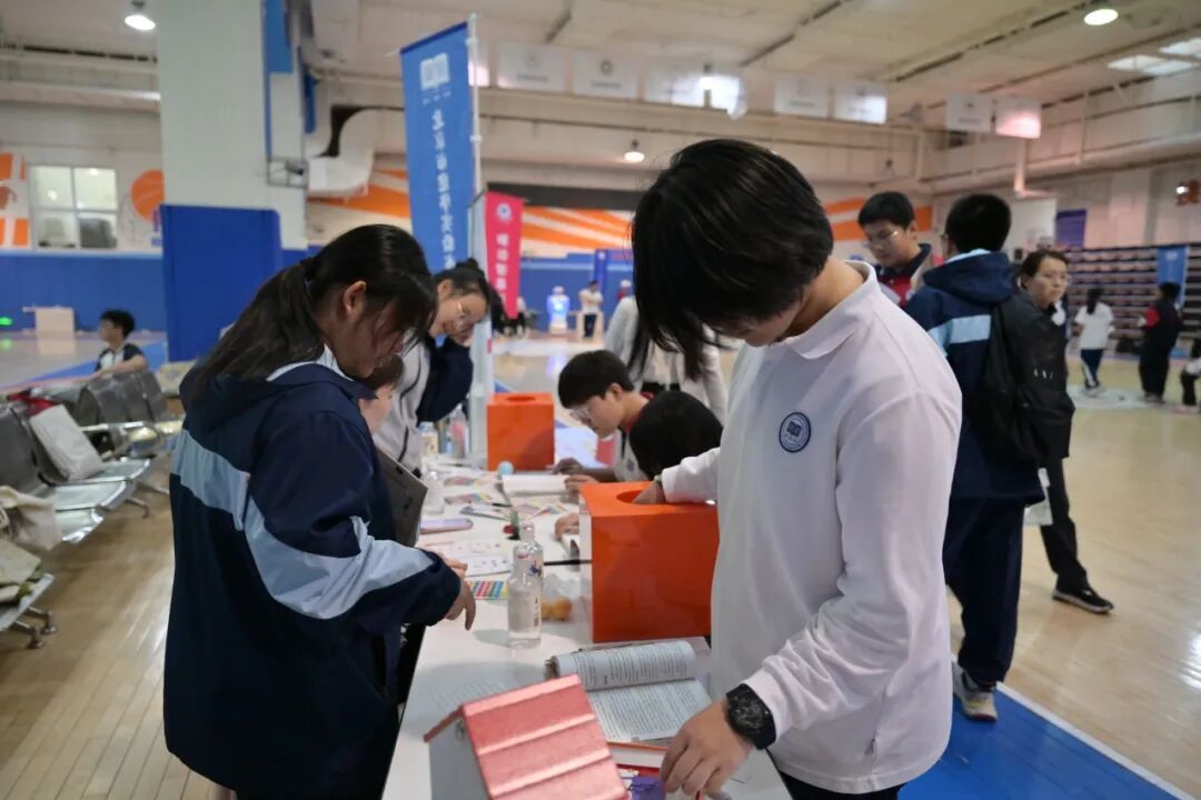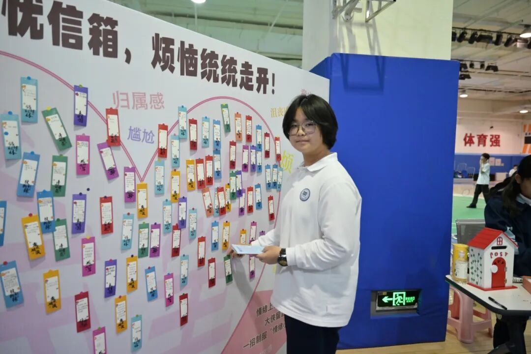 “解忧信箱”前,同学们认真翻阅《情绪词典》,试图在书中找到解忧之道。隔壁摊位,思维接力正在上演:四名同学口述完成“文字传真”,最终版本与原文的差异引发了关于“文学再创造”的热烈讨论。“你和小王子相似,都拥有一颗对世界充满好奇的心!”“你的聪明才智,堪比诸葛孔明!” 不远处,同学们两两一组,学以致“夸”,为彼此拉满情绪价值。