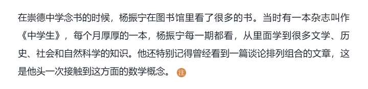 杨振宁先生自幼喜欢阅读,《中学生》杂志就是他上中学时常读的一本杂志。在《杨振宁传》中,有这样一段话:当时有一本杂志叫作《中学生》,每个月厚厚的一本,杨振宁每一期都看,从里面学到很多文学、历史、社会和自然科学的知识。他还特别记得曾经看到一篇谈论排列组合的文章,这是他头一次接触到这方面的数学概念。