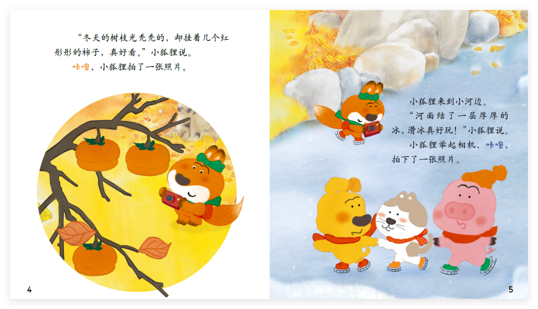 “冬天的树枝光秃秃的,却挂着几个红彤彤的柿子,真好看。”小狐狸说。